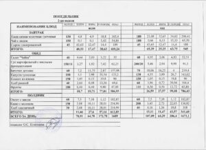 | Завтрак Суфле творожное со сметаной 130/10 Какао с молоком сгущенным 200 г Обед Суп с бобовыми изделиями 200 г Котлеты(биточки) мясные 60 г Овощи тушеные 130 г Компот из плодов свежих(яблоки, груши и т.д.) 200 г Хлеб 30 г Полдник Сок/нектар 200 г Фрукт 180 г Булочка 50 г Ужин Рыба жареная 60 г Пюре картофельное 150 г Хлеб 30 г Чай с сахаром 200 г | Завтрак Яйцо отварное 40 г Каша молочная(овсяная, пшенная, кукурузная и т.д.) 180 г Бутерброд с маслом 35 г Чай с мёдом 200 г Обед Салат из овощей с маслом растительным 60 г Суп молочный с макаронными изделиями 200 г Птица отварная /котлеты рубленные из птицы/кнели из птицы 60 г Картофель отварной 130 г Кисель из сока яблочного 200 г Хлеб 30 г Полдник Молоко /йогурт/бифидин 200 г Фрукт 180 г Кондитерское изделие 20 г Ужин Запеканка овощная 200 г Хлеб 30 г Чай с сахаром 200 г |